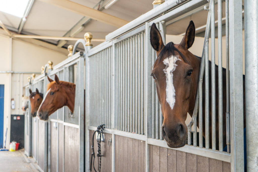 Stabling is arranged in multiple small yards, with no “nose to nose” contact but always ensuring that other horses can be seen and heard in close proximity.
